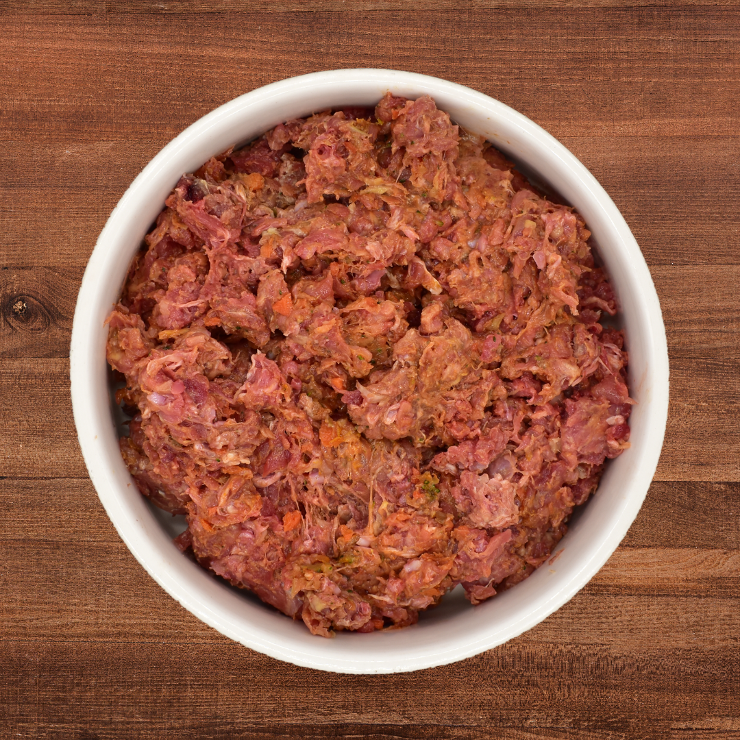 Chicken and Vegetables is a nutritious, balanced raw dog food made from 70% chicken (including 10% chicken bone), 10% chicken offal (kidney, liver), and 20% vegetables, including broccoli, carrot, turmeric, and sea kelp. This premium chunky mince combines high-quality protein with the added benefits of nutrient-rich vegetables.