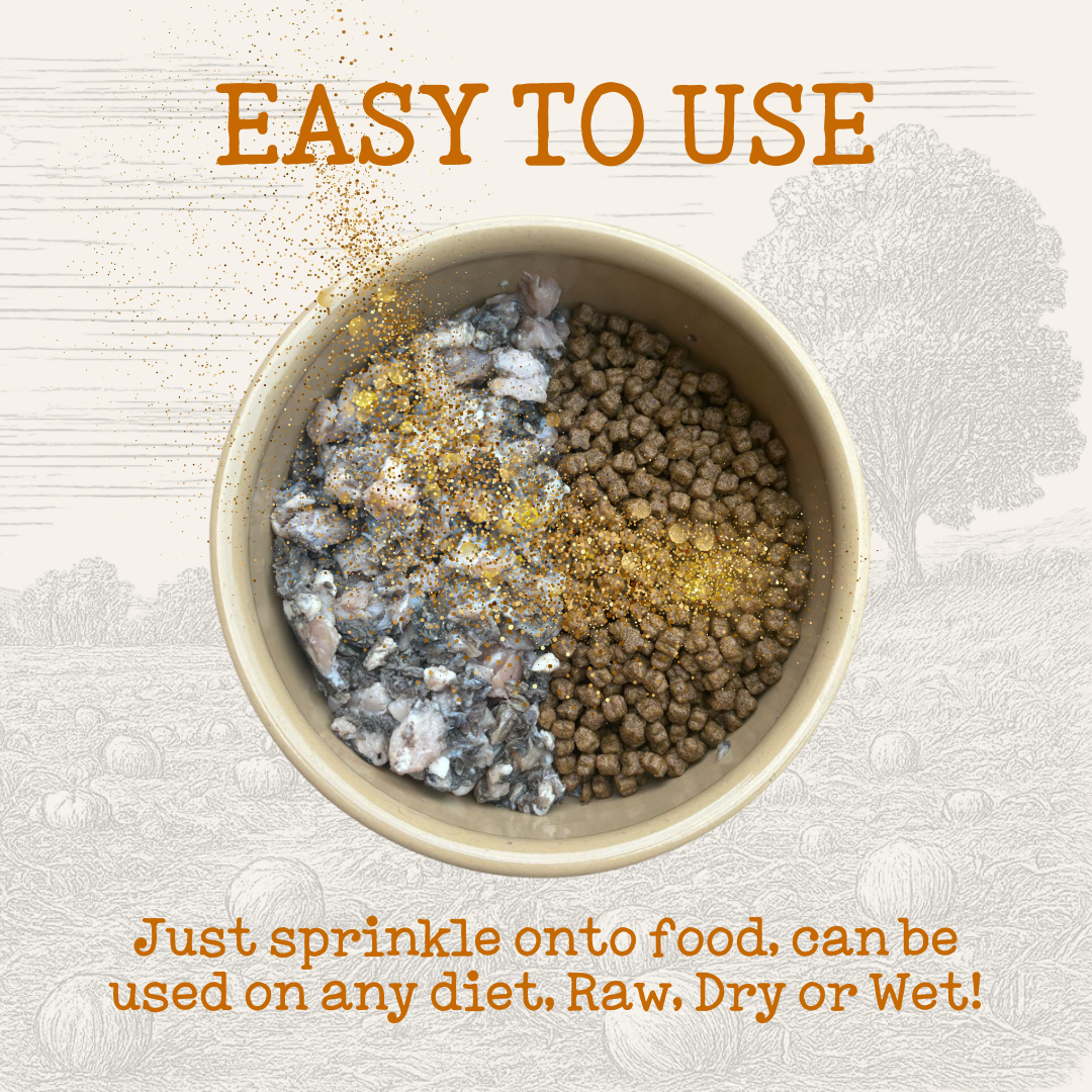 Simply sprinkle the recommended dosage over your dog’s regular food or mix it with water to create a tasty paste.